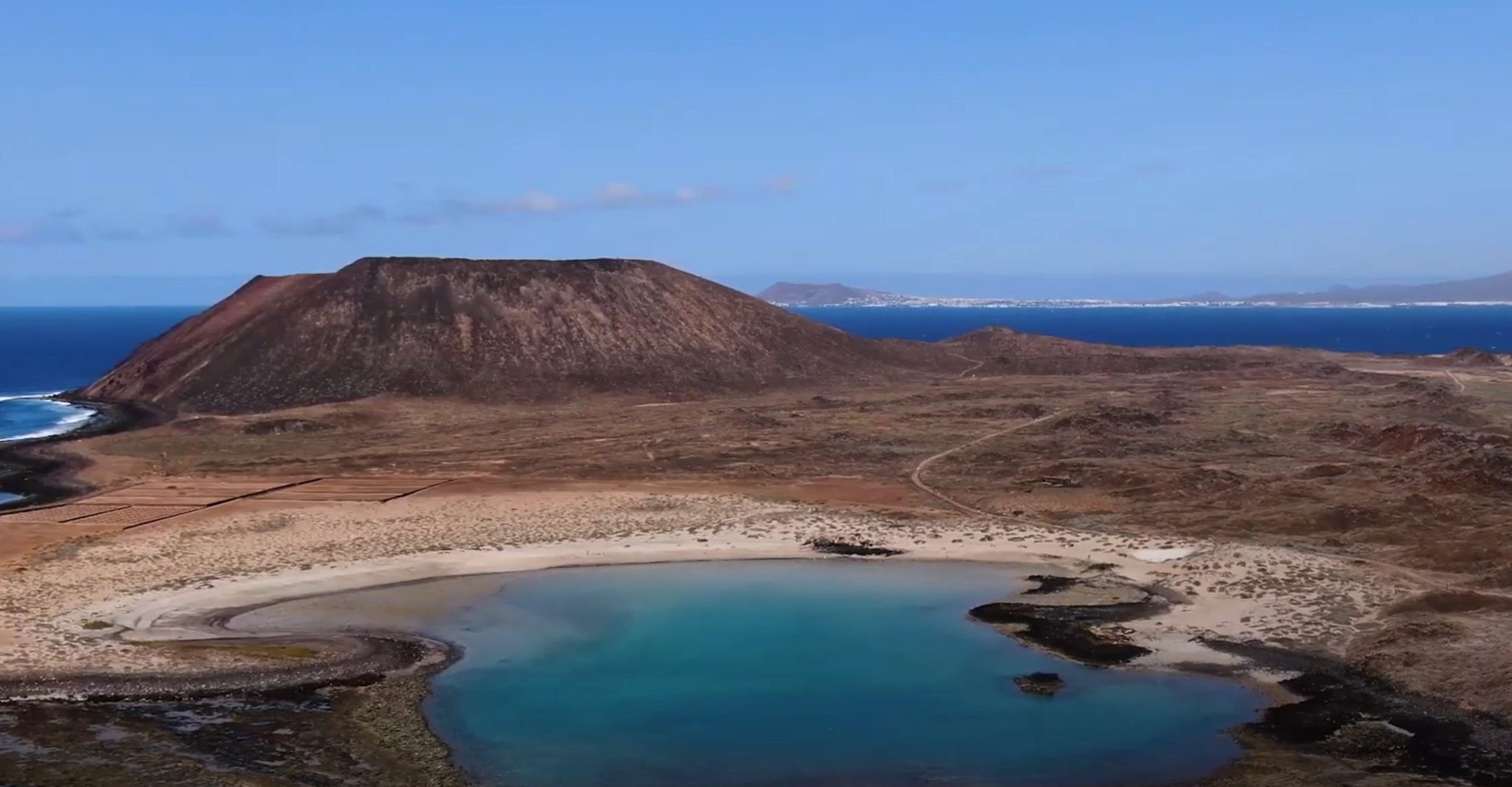 Playa La Concha, con su arena blanca y aguas tranquilas, es el lugar ideal para relajarte y disfrutar del paisaje volcánico de la Isla de Lobos.